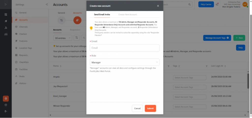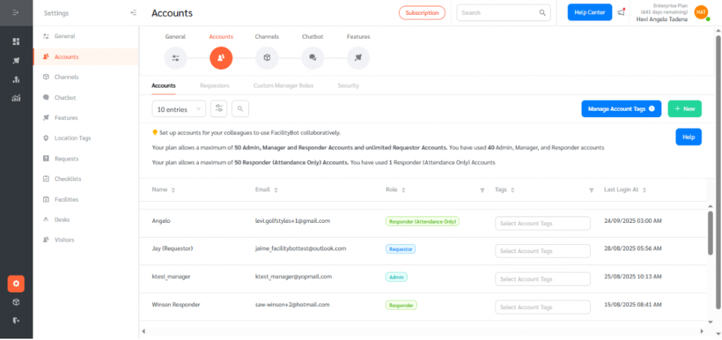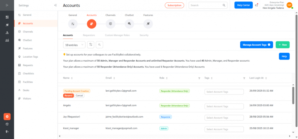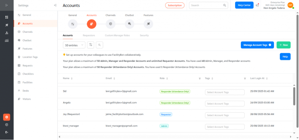 - Log in to the FacilityBot Admin Portal, go to Settings → Accounts, and click + New in the upper right corner.
