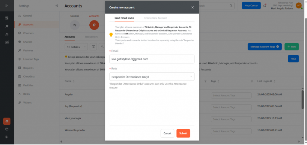 - Enter the Responder’s email address, select Responder (Attendance Only) under Role, and click Submit to send the invite