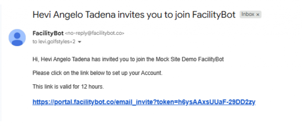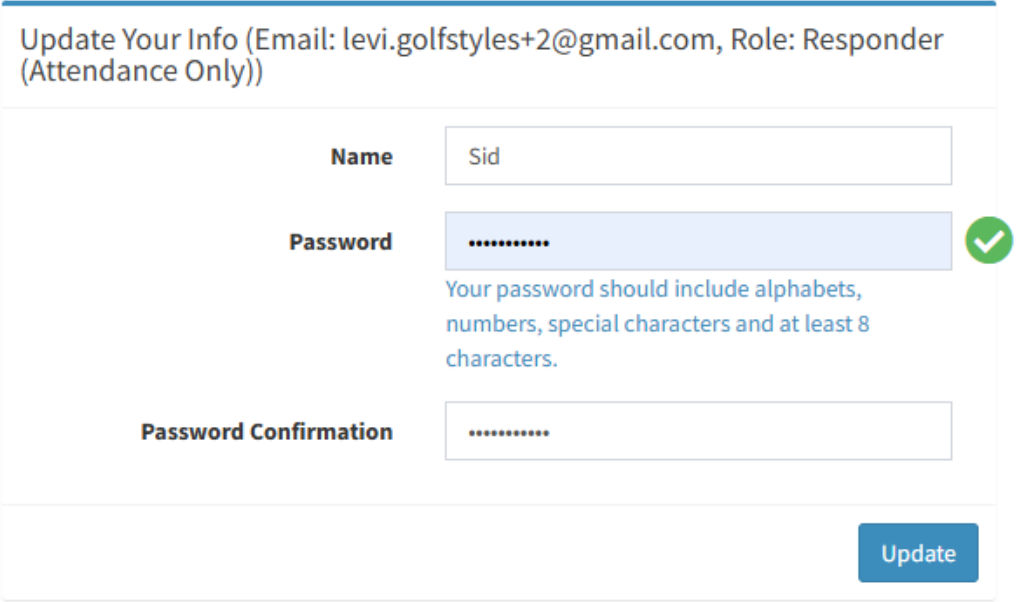 - After clicking the invite link, the Responder sets their name and password, clicks Update, and can then log in to the FacilityBot mobile app
