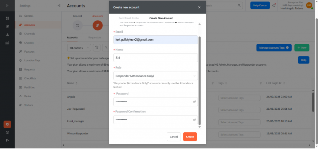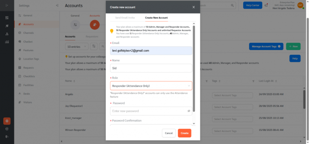 - Set a password and confirm it on behalf of the Responder, then click Create to finalize the account