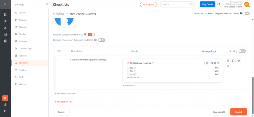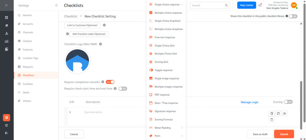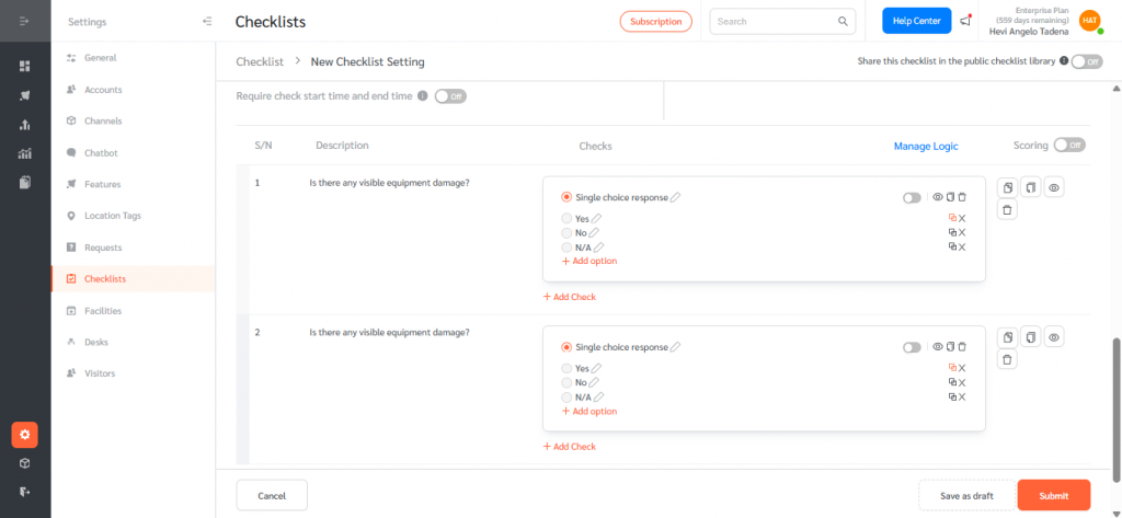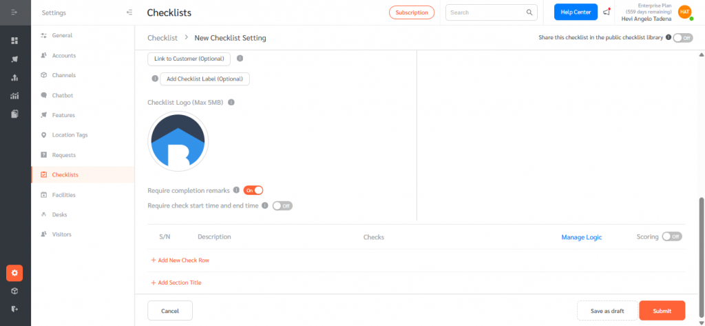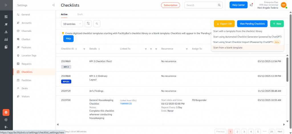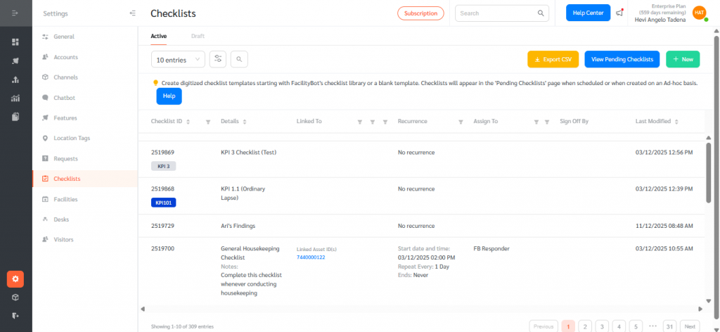 To use this feature, log in to the FacilityBot Manager Portal, then navigate to Settings → Checklists.