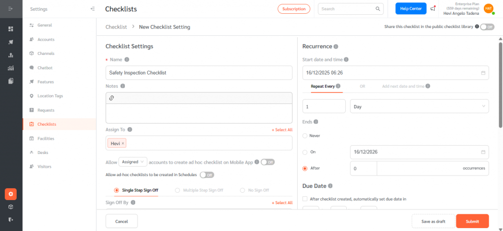 - Name the checklist, assign responders and managers, and configure any recurrence settings as needed.