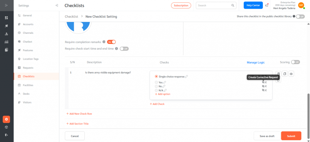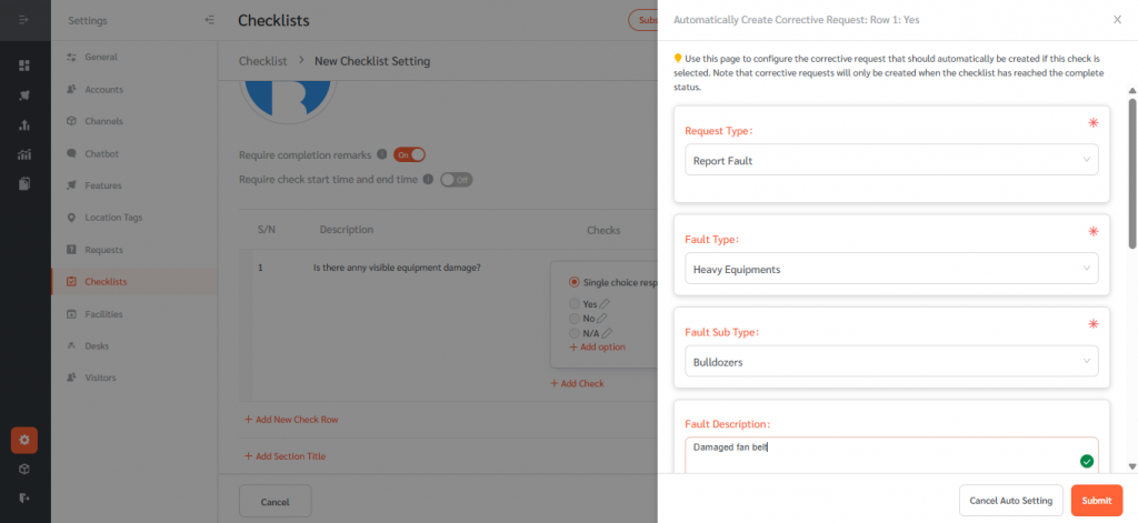 The Auto Create Corrective Requests feature allows Facility Managers to automatically generate corrective requests based on specific checklist responses. This ensures that issues identified during inspections or maintenance checks are immediately logged as requests—without requiring manual follow-up—improving response time, accountability, and workflow efficiency.