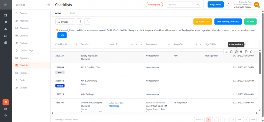 - Hover over the newly created checklist and click Create Ad-hoc to generate a pending checklist.
