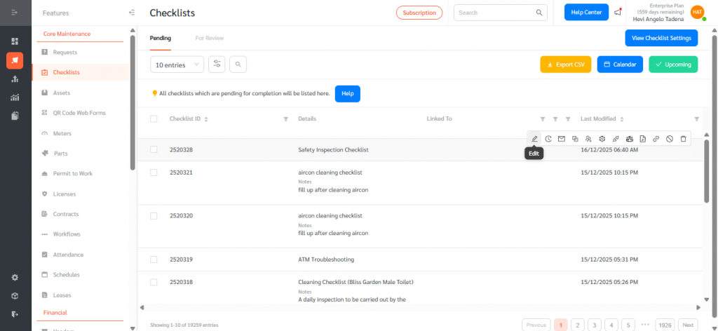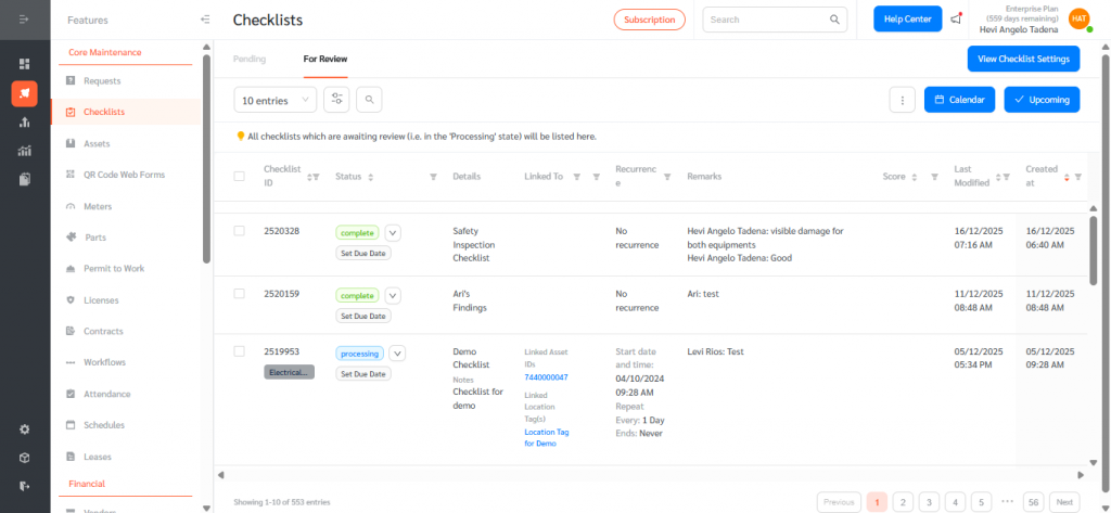- After the checklist reaches Complete status, navigate to the Requests page.You will see a new corrective request automatically created and linked to the completed checklist—just as if it had been created manually.