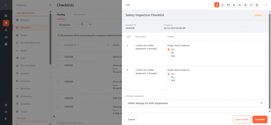 With this feature, corrective requests are pre-configured at the checklist level and are automatically created when the checklist reaches Complete status and the defined response condition is met.