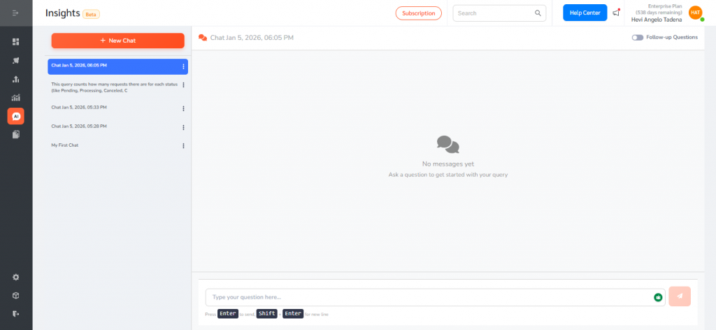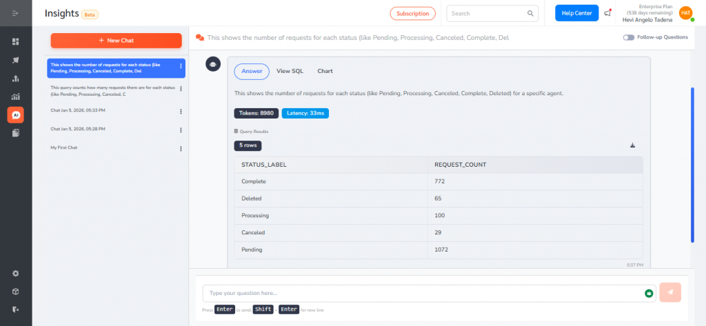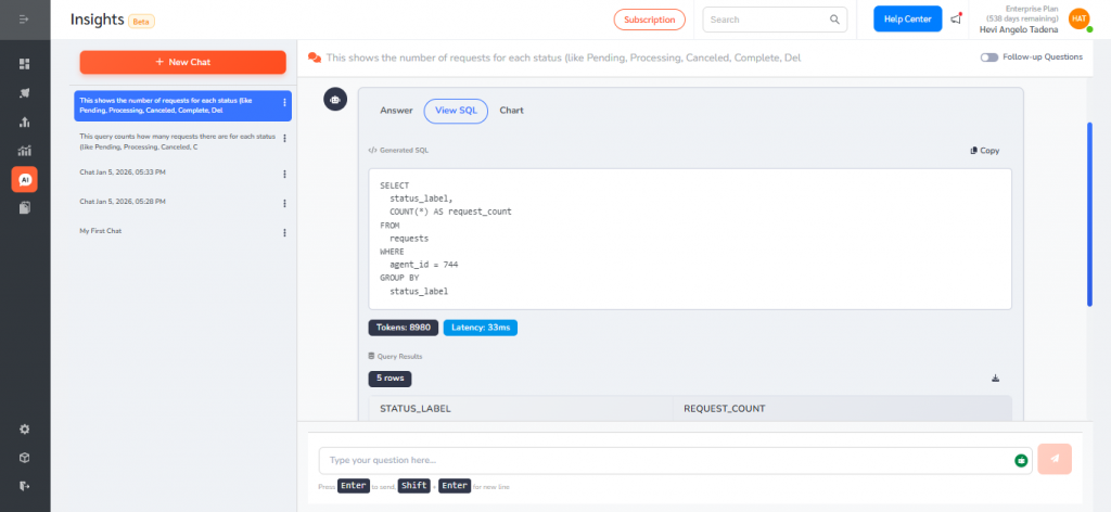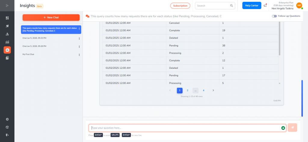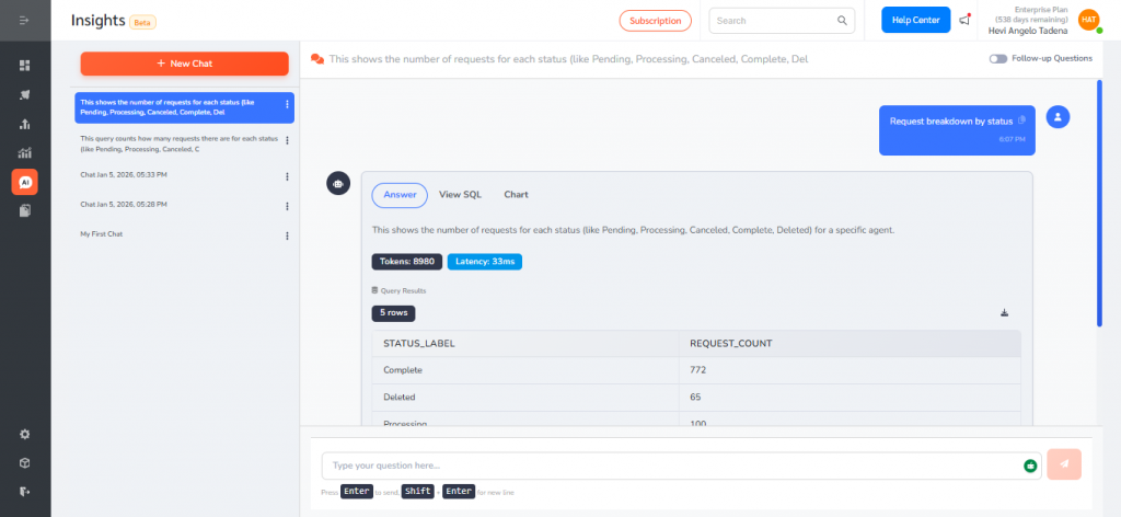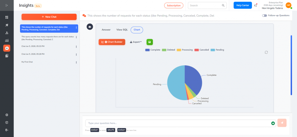 - Type a question in plain language (for example: “Request breakdown by status” or “What is the trend of request status over the past 12 months?”).
