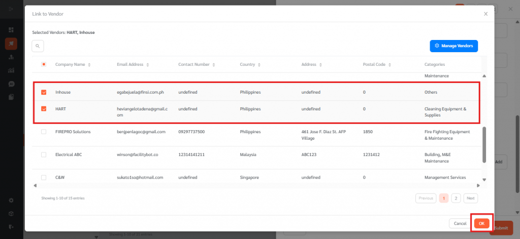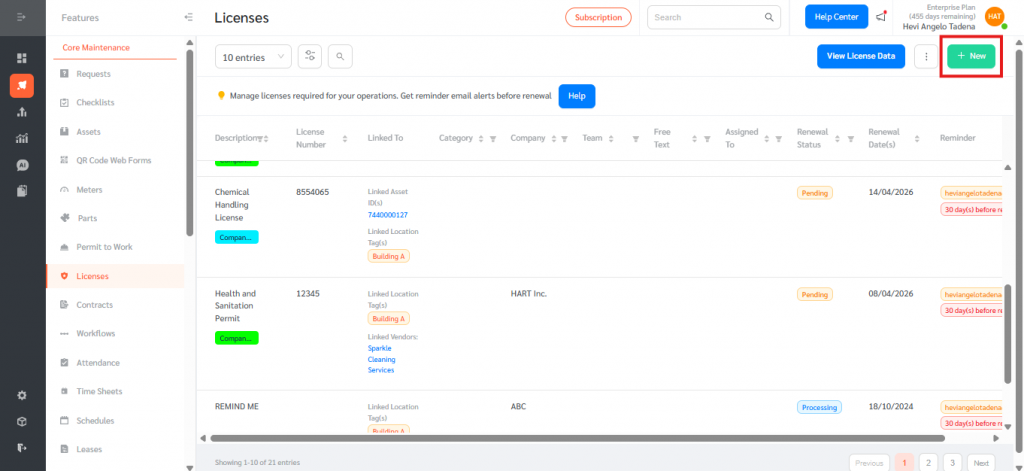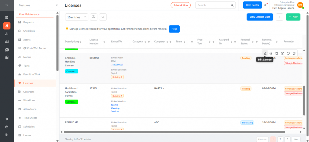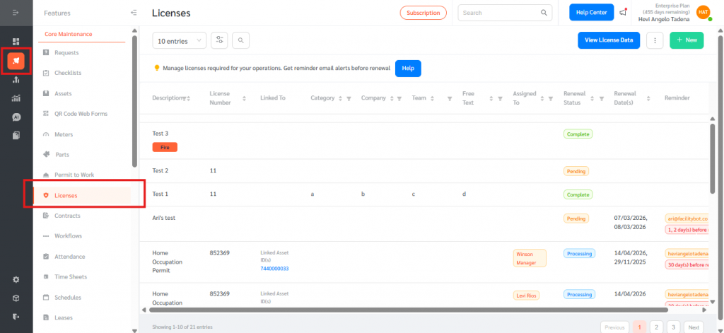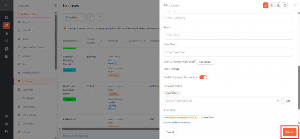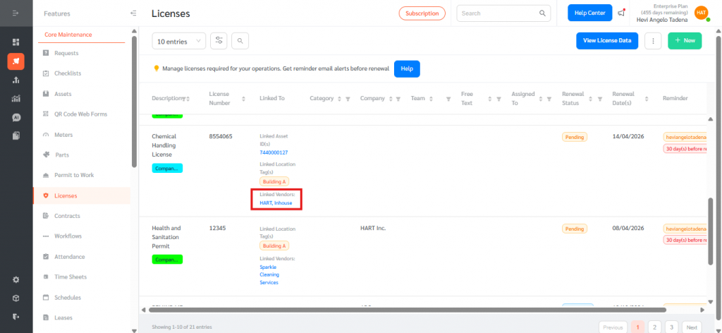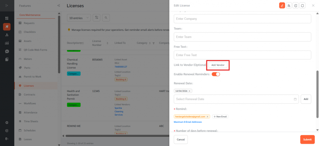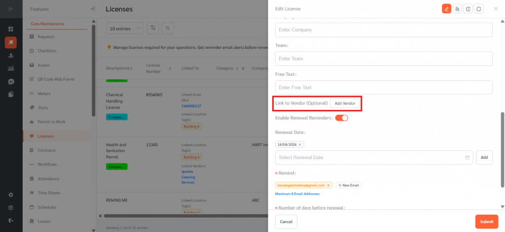 FacilityBot allows users to link vendors directly to Licenses, enabling better tracking of vendor relationships associated with compliance, permits, and certifications. This ensures that all relevant vendor information is centralized and easily accessible within each license record.