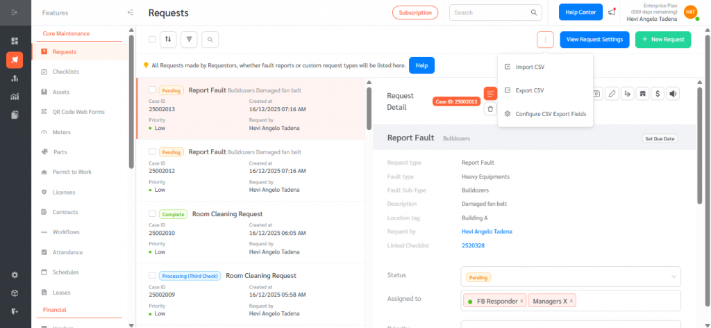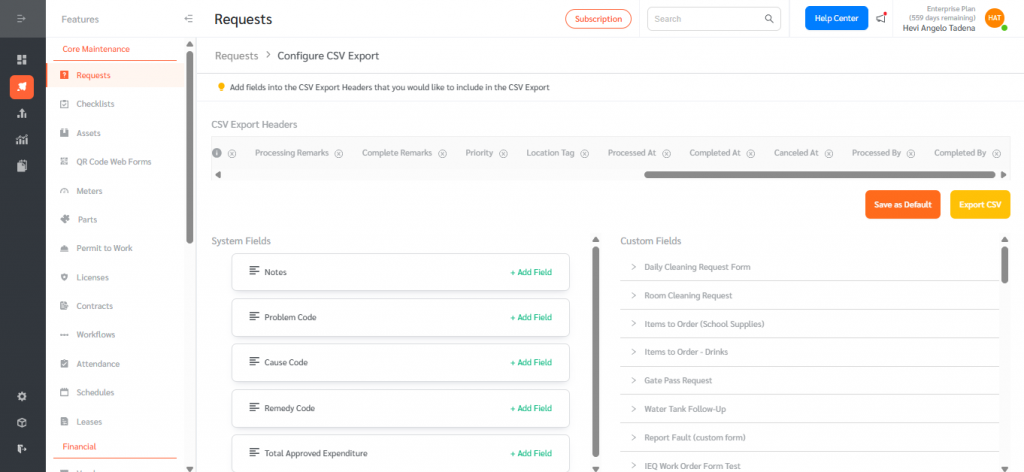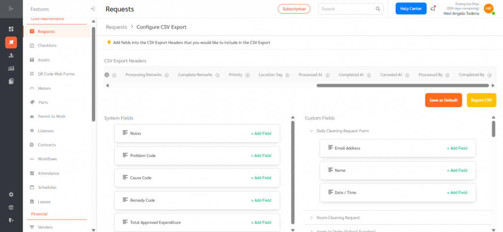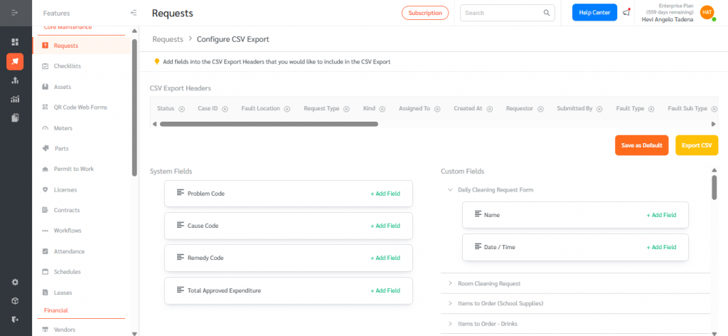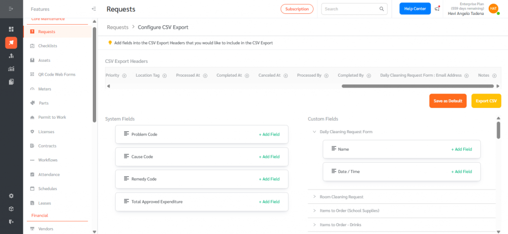 FacilityBot allows users to configure CSV Export for Requests, giving teams full control over which fields are included in CSV exports and in what order. This feature is useful when different stakeholders (operations, finance, audits, reporting) require specific datasets, column arrangements, or custom fields for analysis and record-keeping.