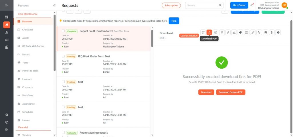 Once saved, requests of that type will be able to produce a Download Custom PDF option from the Request Detail page.