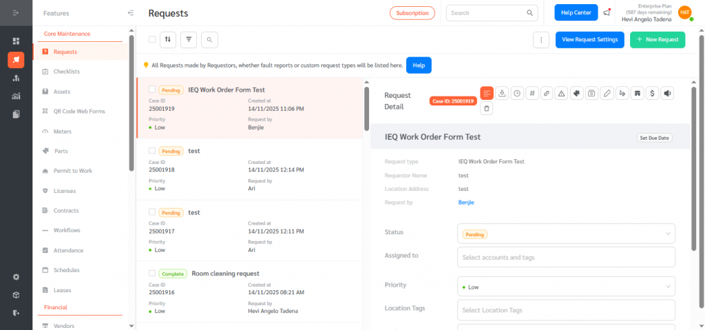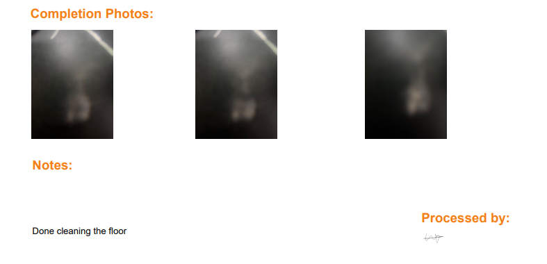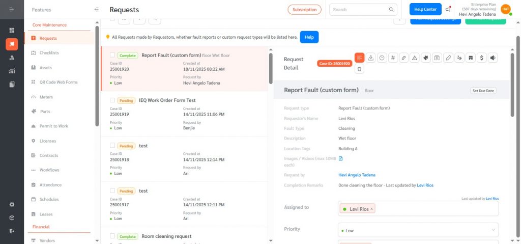- On the Request Detail page: assign the request, upload Processing/Completion/Fault images, add notes and signatures.