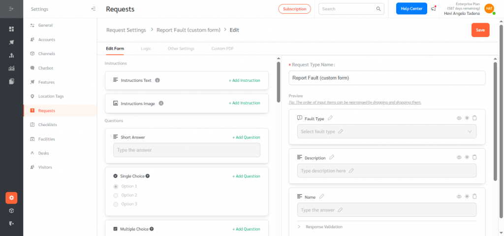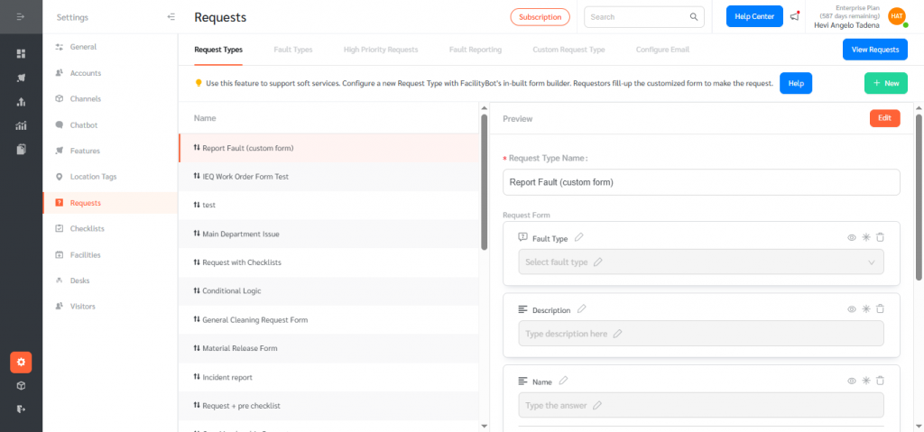 - Log in to the FacilityBot Web Portal → Settings → Requests → Request Types.