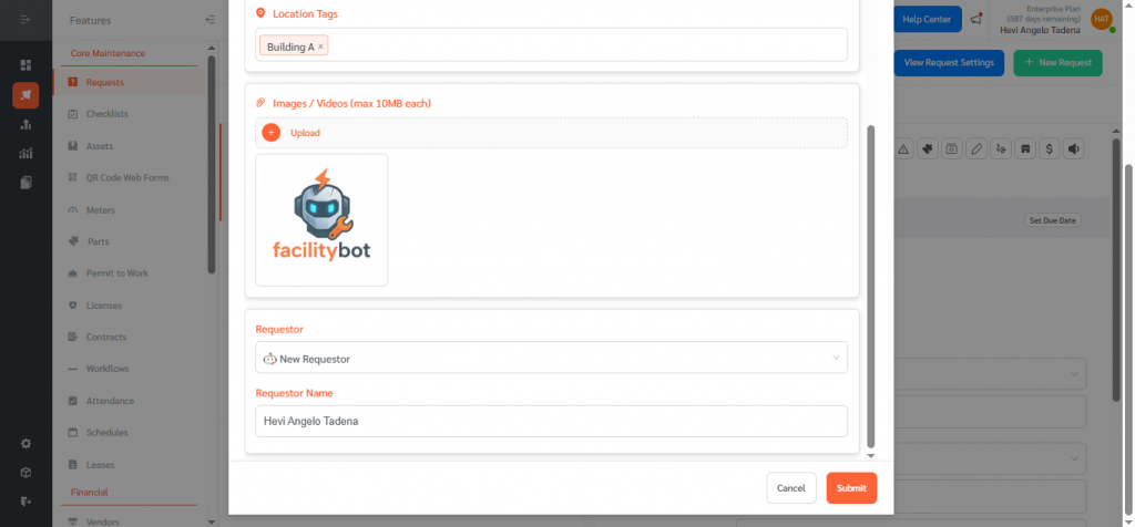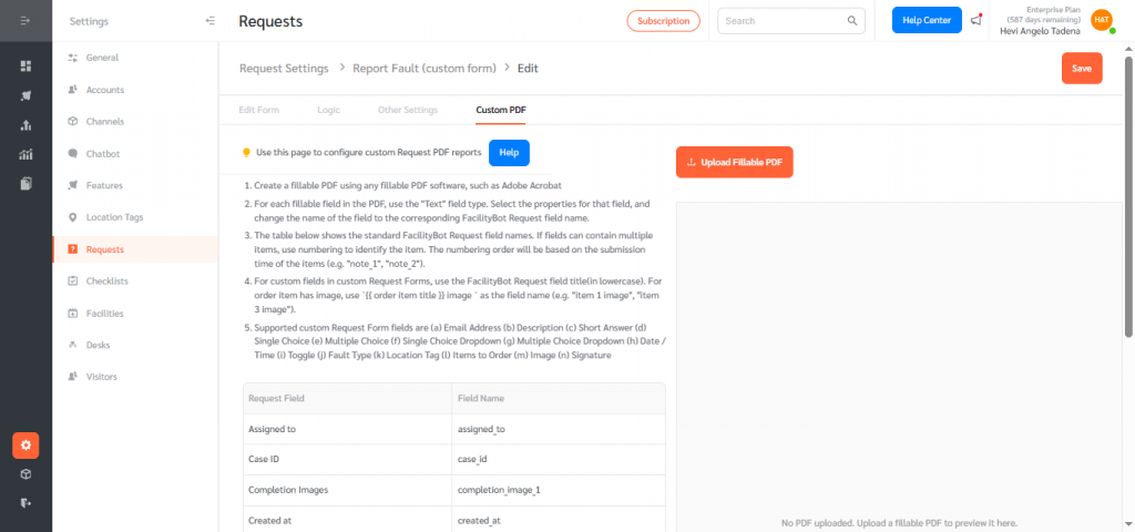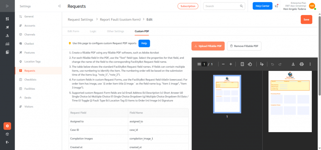 FacilityBot supports Custom PDF Output for Requests — this lets you upload a fillable PDF template and populate it automatically with data from a Service Request. Use this when customers already have a standard form (e.g., permits, inspection reports, vendor forms) and want FacilityBot to produce a completed PDF that mirrors that template.