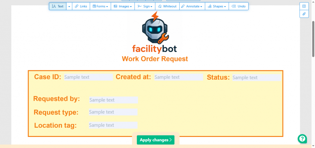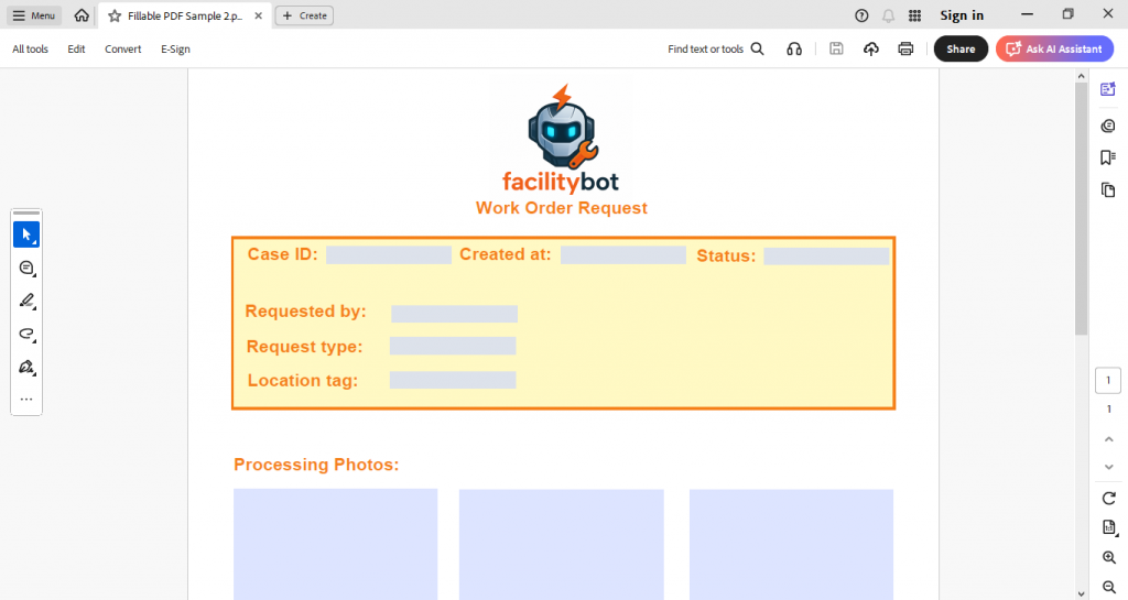 When configured, users can submit requests as usual; approvers and processors can add images, notes, signatures, and the system will generate a PDF with those fields filled in. This article explains how to prepare the PDF, map FacilityBot fields to PDF fields, enable the feature, and troubleshoot common issues.