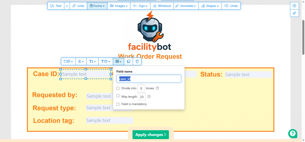 - For every value you want FacilityBot to fill, insert a Text field (single-line). Do not use specialized widgets like signature widgets, textarea/multiline fields, or non-text widgets. Use Text fields only.