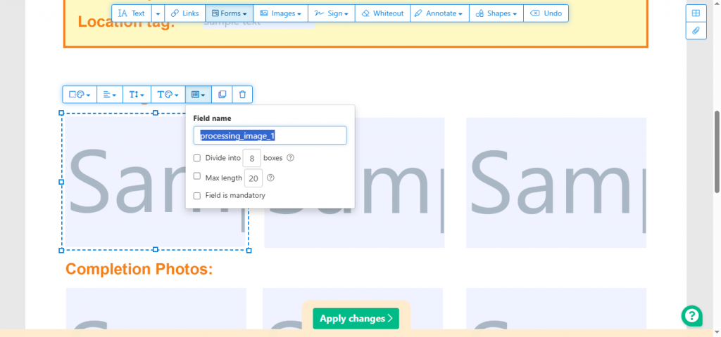 - For forms that include images: add a Text field for each image placeholder and name it following the standard request field reference. If a field may contain multiple entries (notes, images, assignments, items), create multiple numbered fields: note_1, note_2, processing_image_1, processing_image_2 etc. Numbering order corresponds to submission order.