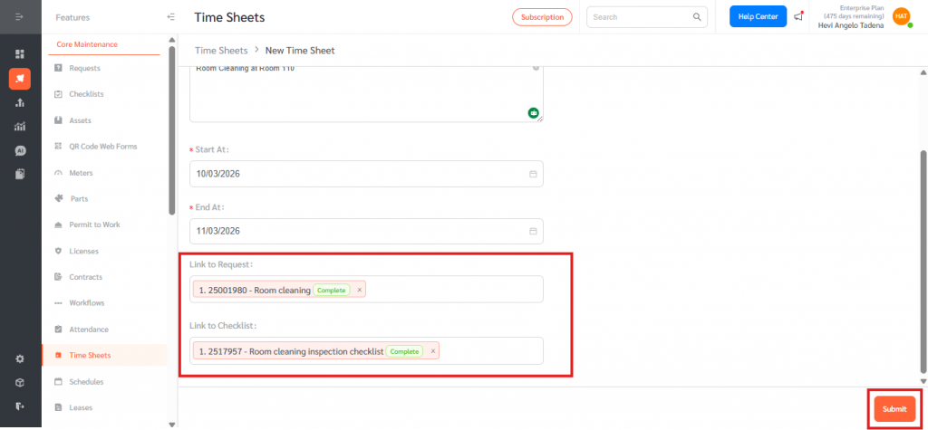 The feature enables users to create time sheets while ensuring that time tracking is synchronized with task completion. When a checklist is completed with a start and end time, the system automatically validates and saves this information to the corresponding time sheet.