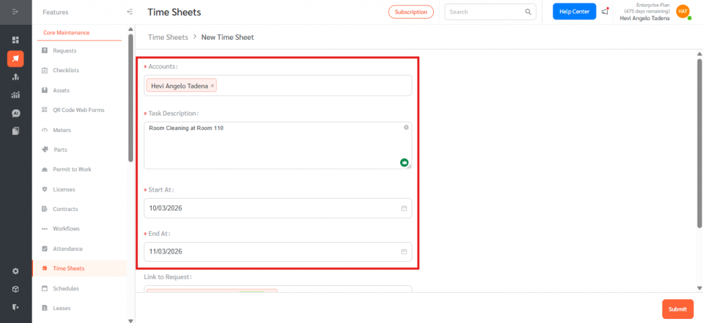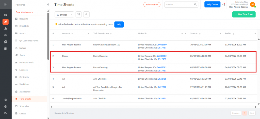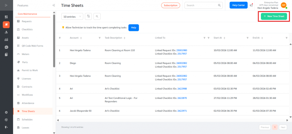 FacilityBot now supports the Time Sheets feature, allowing teams to record and manage work time associated with facility tasks. Time sheets can be linked directly to Requests or Checklists, helping administrators and managers track the time spent on operational activities more accurately.