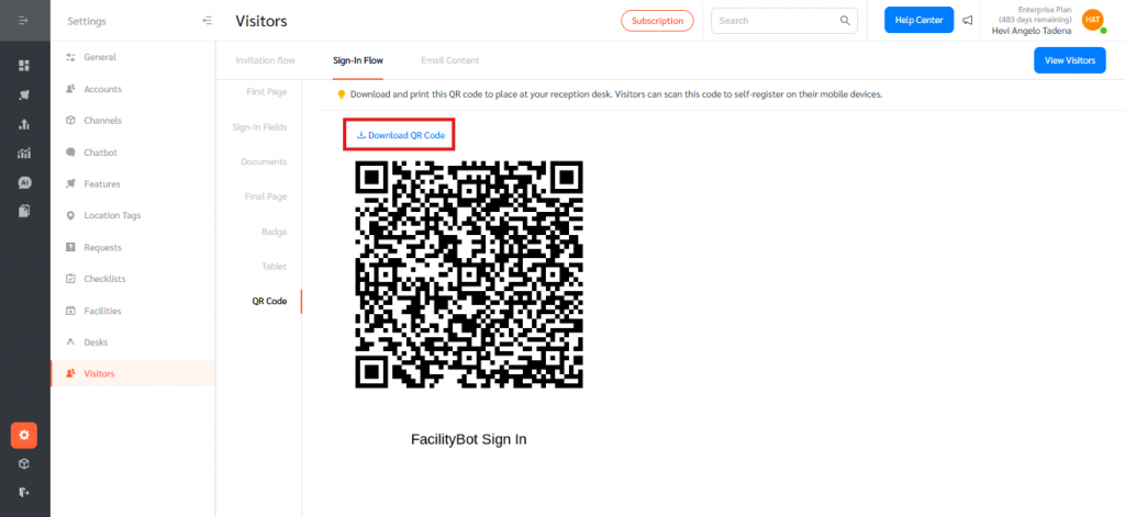To access the Visitor QR Code in FacilityBot: