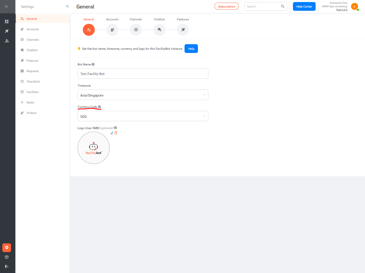 Admins can set the appropriate currency code, which will be used for all financial features in FacilityBot, in Settings -> General.