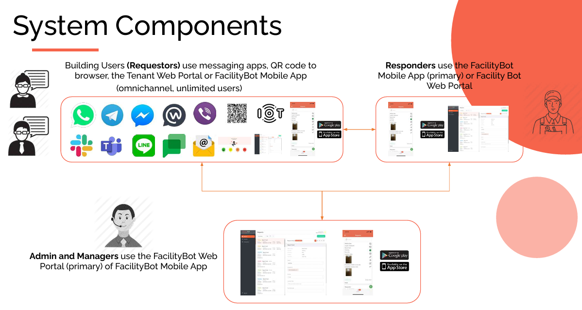 FacilityBot has several system components, including messaging apps, web portals, and mobile apps. Multi-language support is available for all these components.