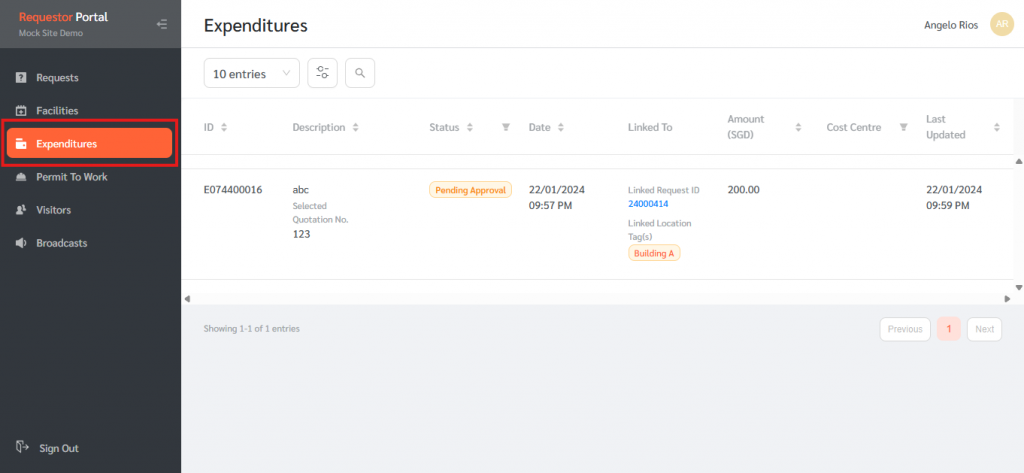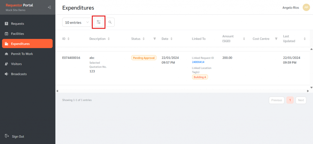 The expenditures page in the Requestor portal can be configured to allow you to view columns that are of interest. Expenditure requests that are sent to you for approval will appear as individual rows.