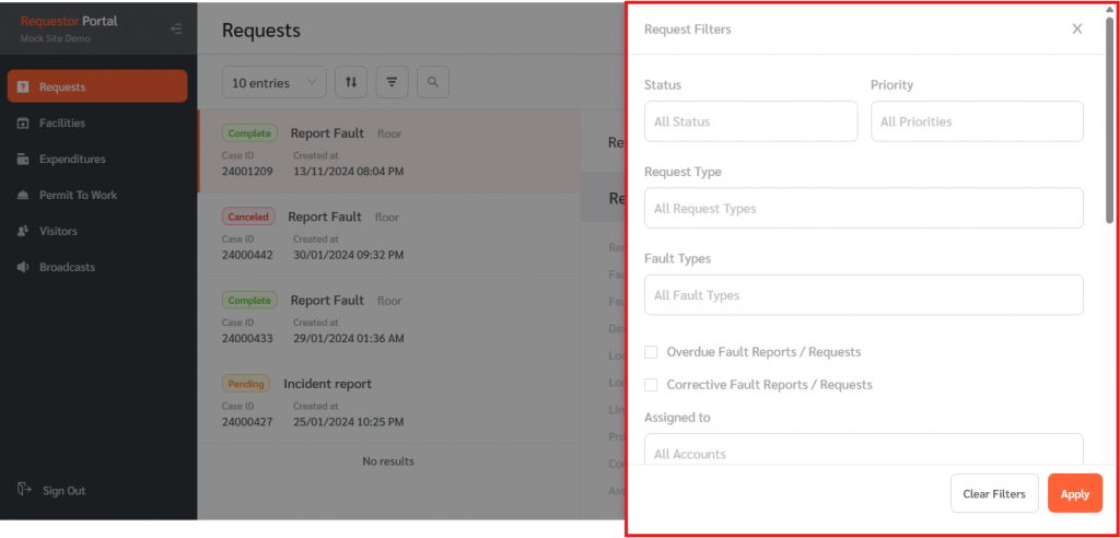 To view requests based on specific criteria, you can use the filter icon in the Requests page. You can filter requests based on Status, Request Type, Fault Type, Fault Location and Date Range.