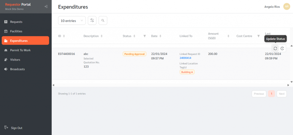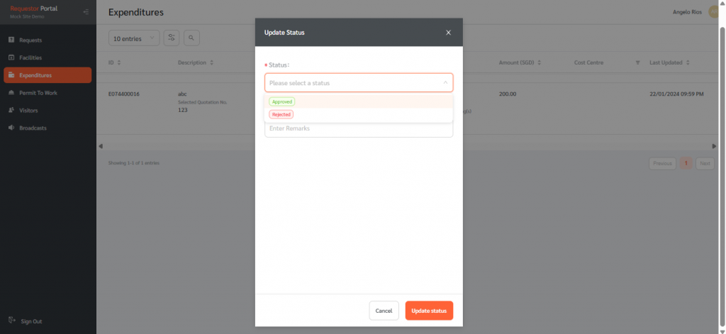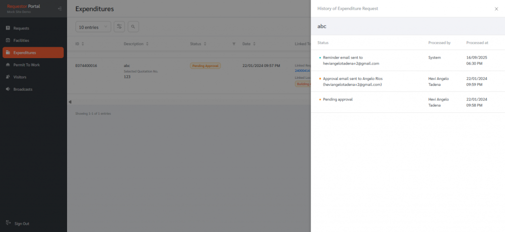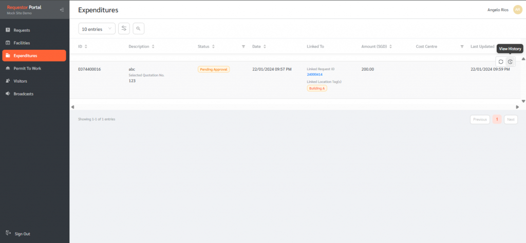 If there are any expenditures sent to a Requestor for approval, it will appear in the expenditure page of the Requestor portal. The Requestor will be able to view details of each expenditure, view its history and approve or reject that expenditure.