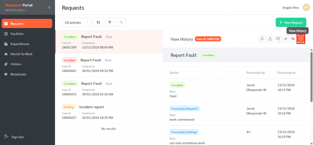 Requests history refers to the list of actions that has been taken with regard to the Request. It shows “who did what, when”, including the status of the requests, any assignments or re-assignments and date and time stamps for each action. This article describes the steps to viewing the request in the web portal.