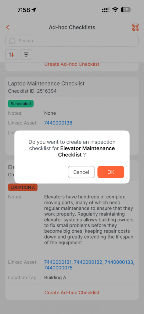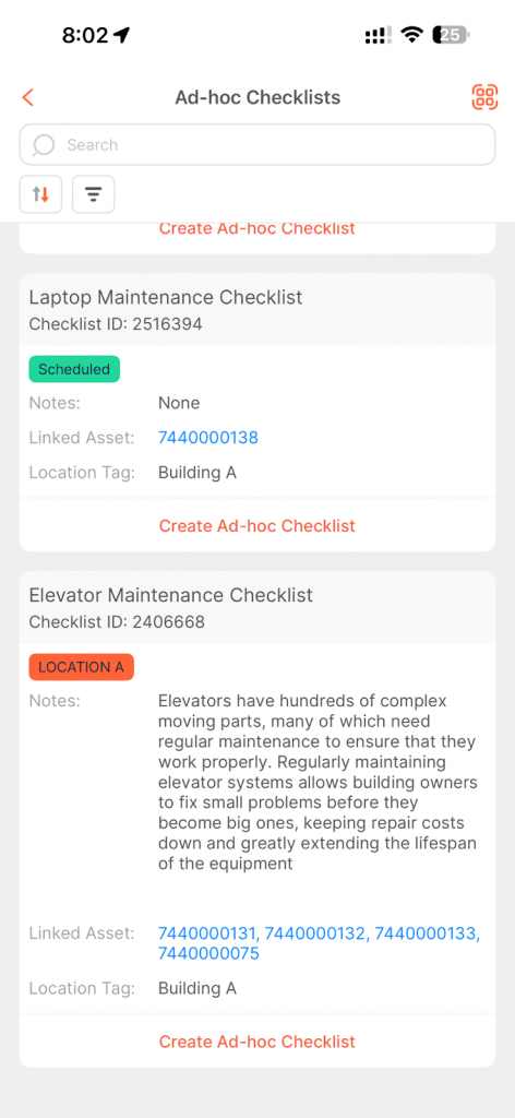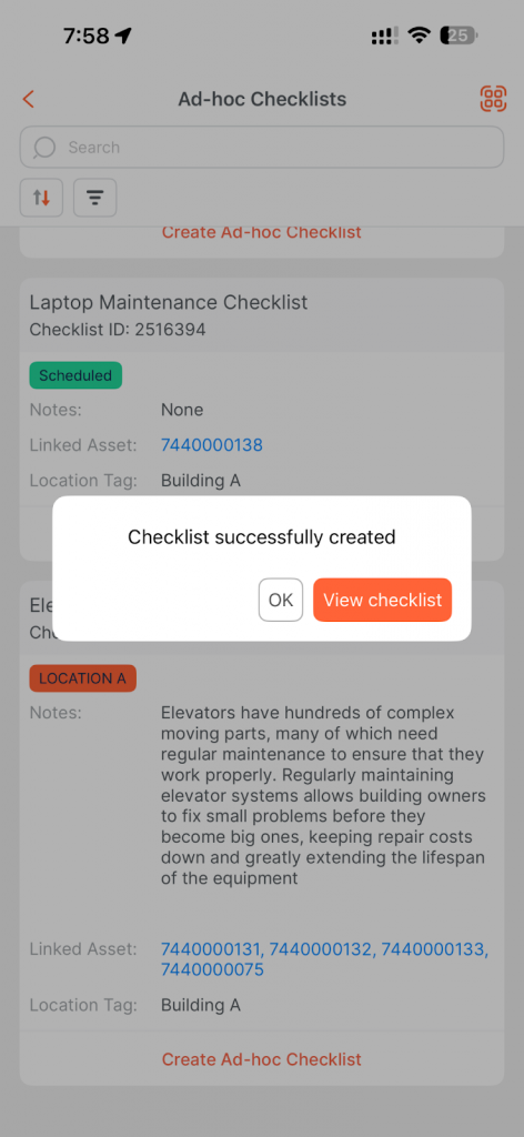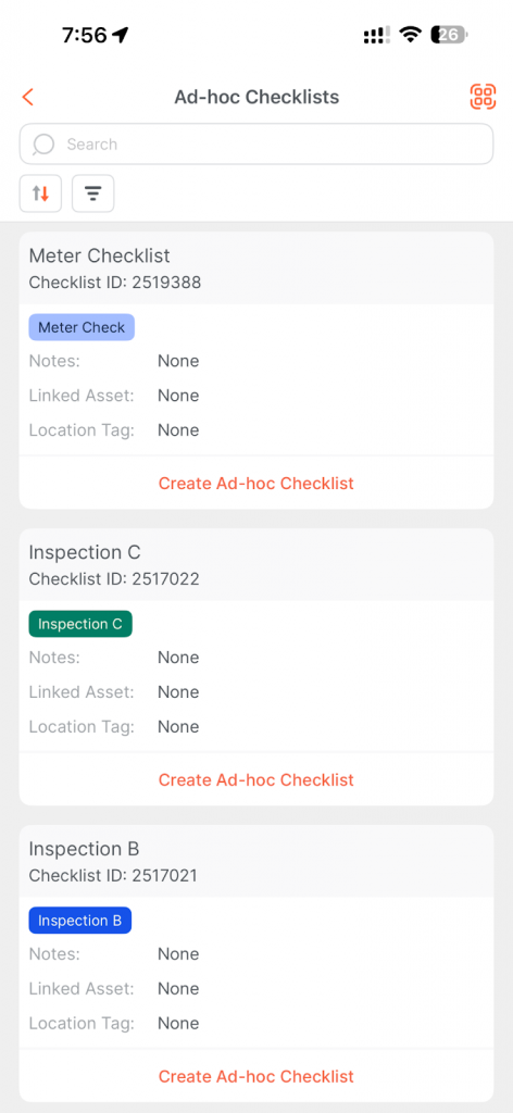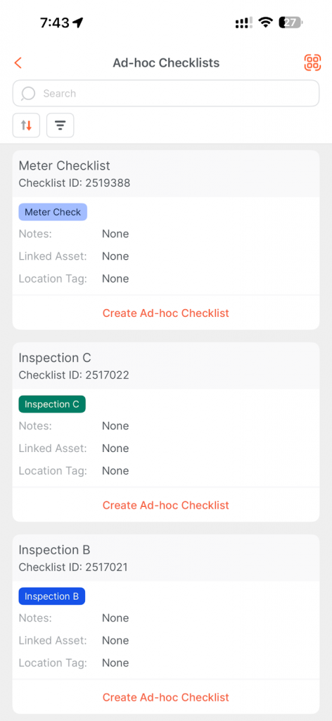 - Upon scanning, the system automatically generates a new Ad Hoc checklist instance linked to that QR code. The newly created checklist will appear in your checklist list for completion.