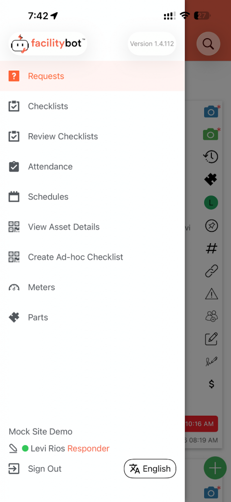 - Open the FacilityBot Mobile App. Tap the three-bar (☰) menu icon located in the upper-left corner of the screen.