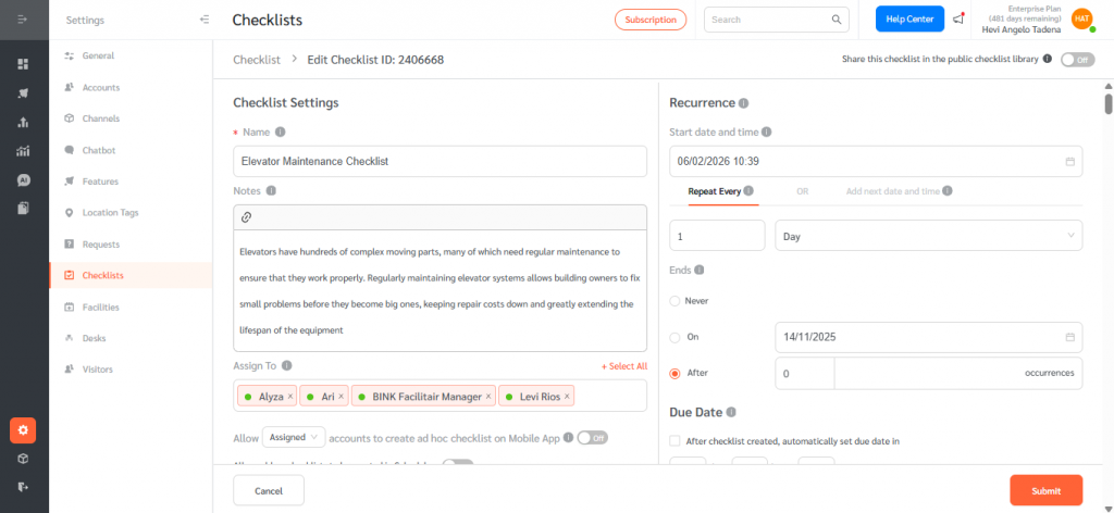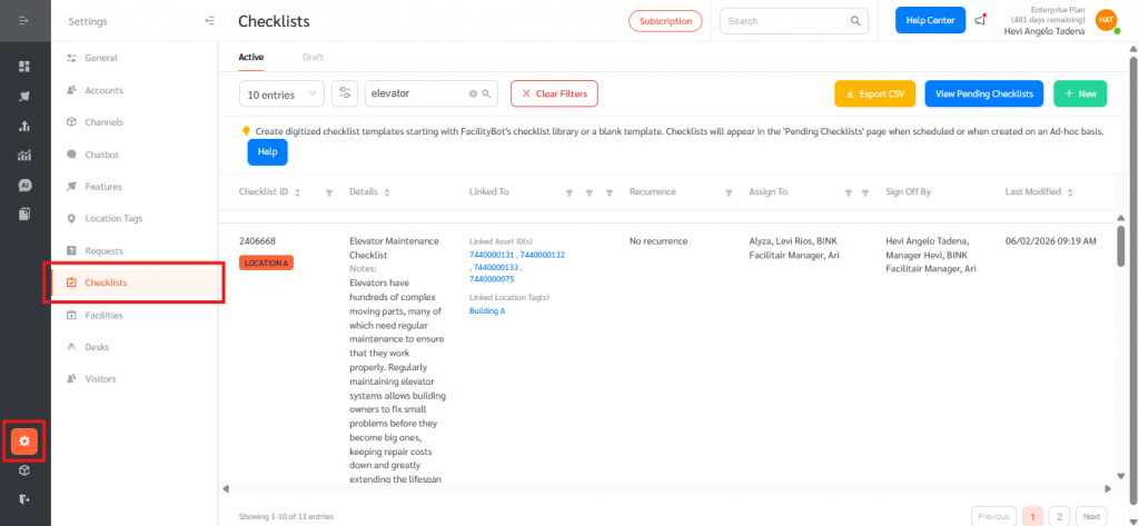 - Go to Facilitybot Web Portal Settings. Click on Checklists.