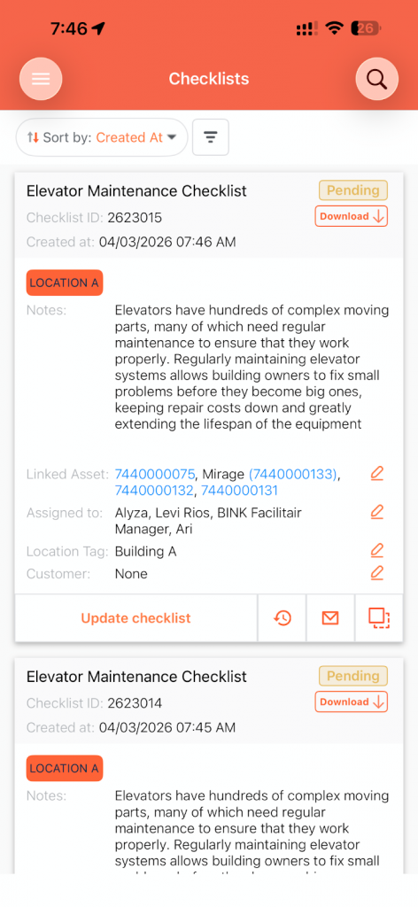 Once created, the checklist can be completed directly within the app and is automatically logged in the system for proper record keeping.