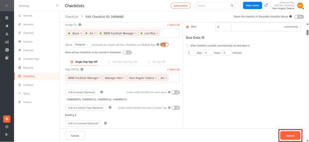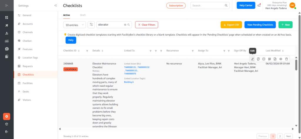 - Hover over and edit the existing checklist you want to enable for ad hoc creation.