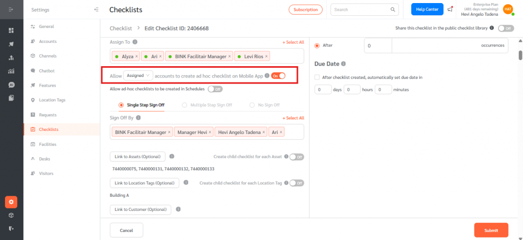 - Scroll down to locate the option: “Allow assigned/all accounts to create ad hoc checklist on Mobile App.”