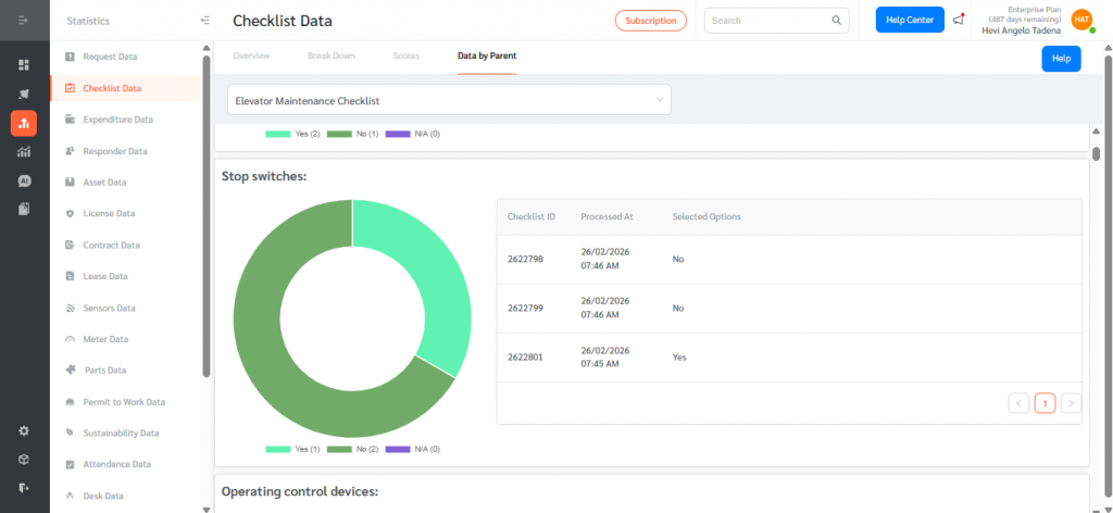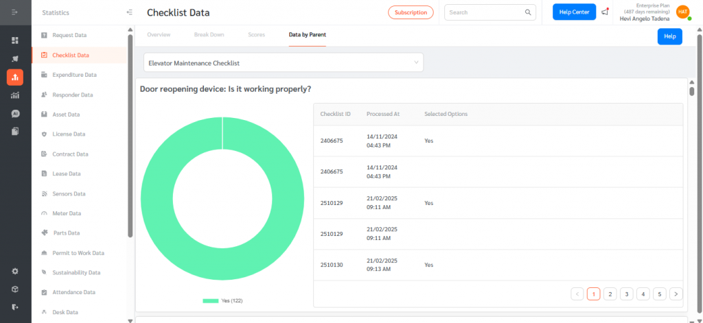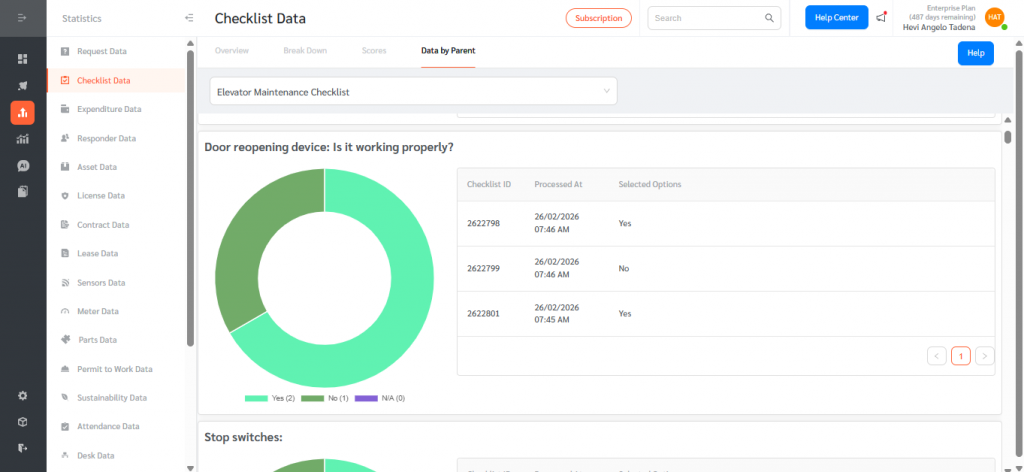 The Data by Parent feature centralizes response aggregation across child checklists, provides donut chart visualizations for supported response types, and displays detailed response tables with standardized date formatting.By combining visual analytics with detailed records, Data by Parent enables teams to monitor checklist performance, identify trends, ensure compliance, and make informed, data-driven decisions efficiently within FacilityBot.