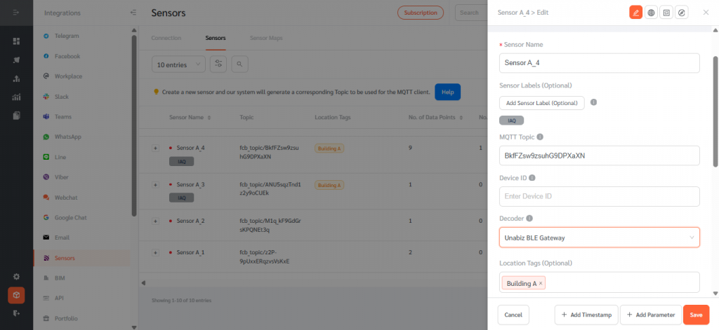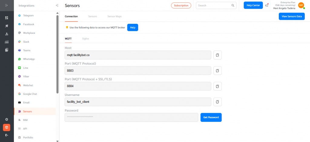 - Log in to FacilityBot. Go to Integrations → Sensors.