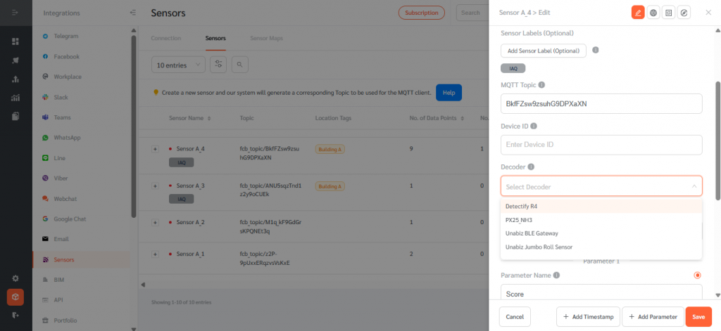- Select the appropriate decoder for the sensor model from the dropdown list. Click Save.